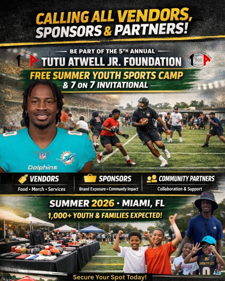 The Tutu Atwell Junior Foundation is gearing up for the 5th Annual Free Summer Youth Sports Camp & 7 on 7 Invitational, and we’re looking for vendors, sponsors, and community partners to join us in making this event bigger and better than ever!
